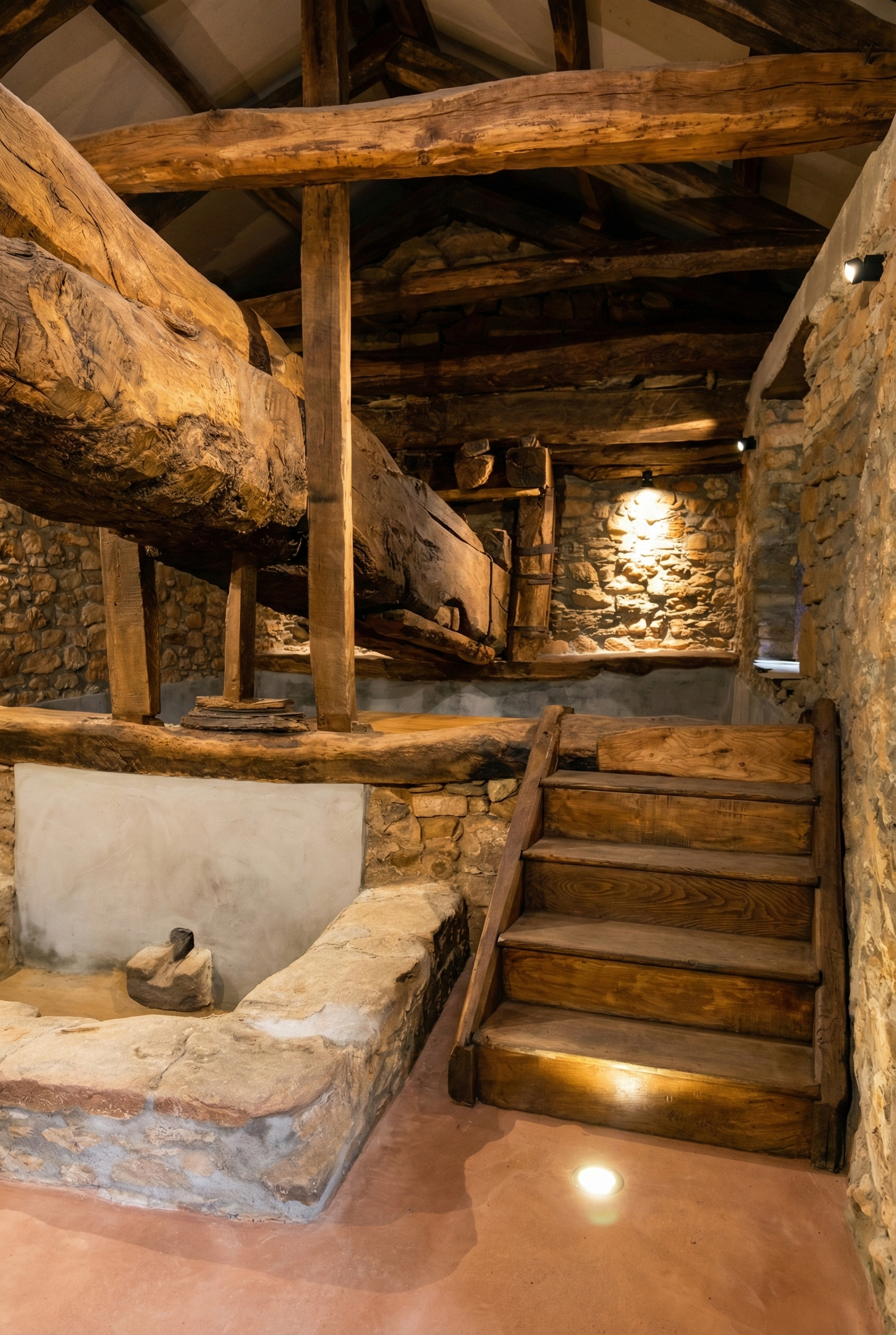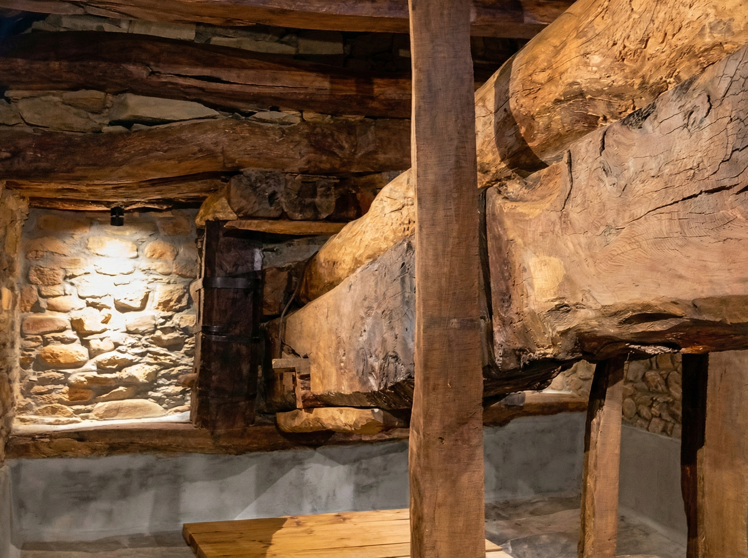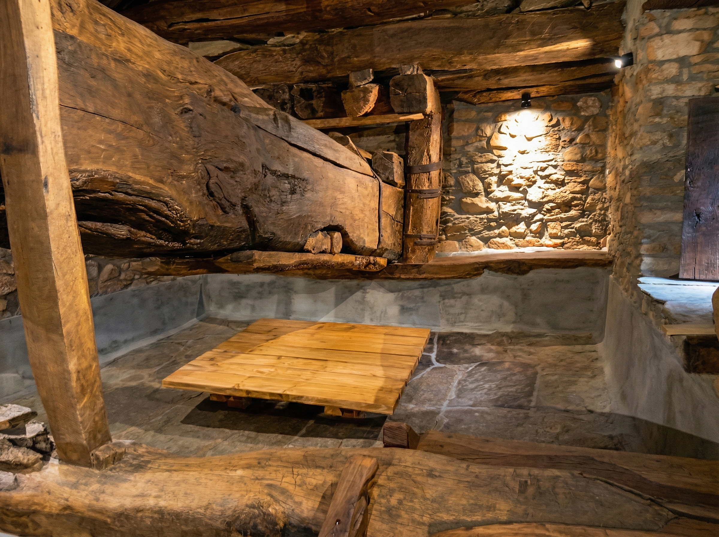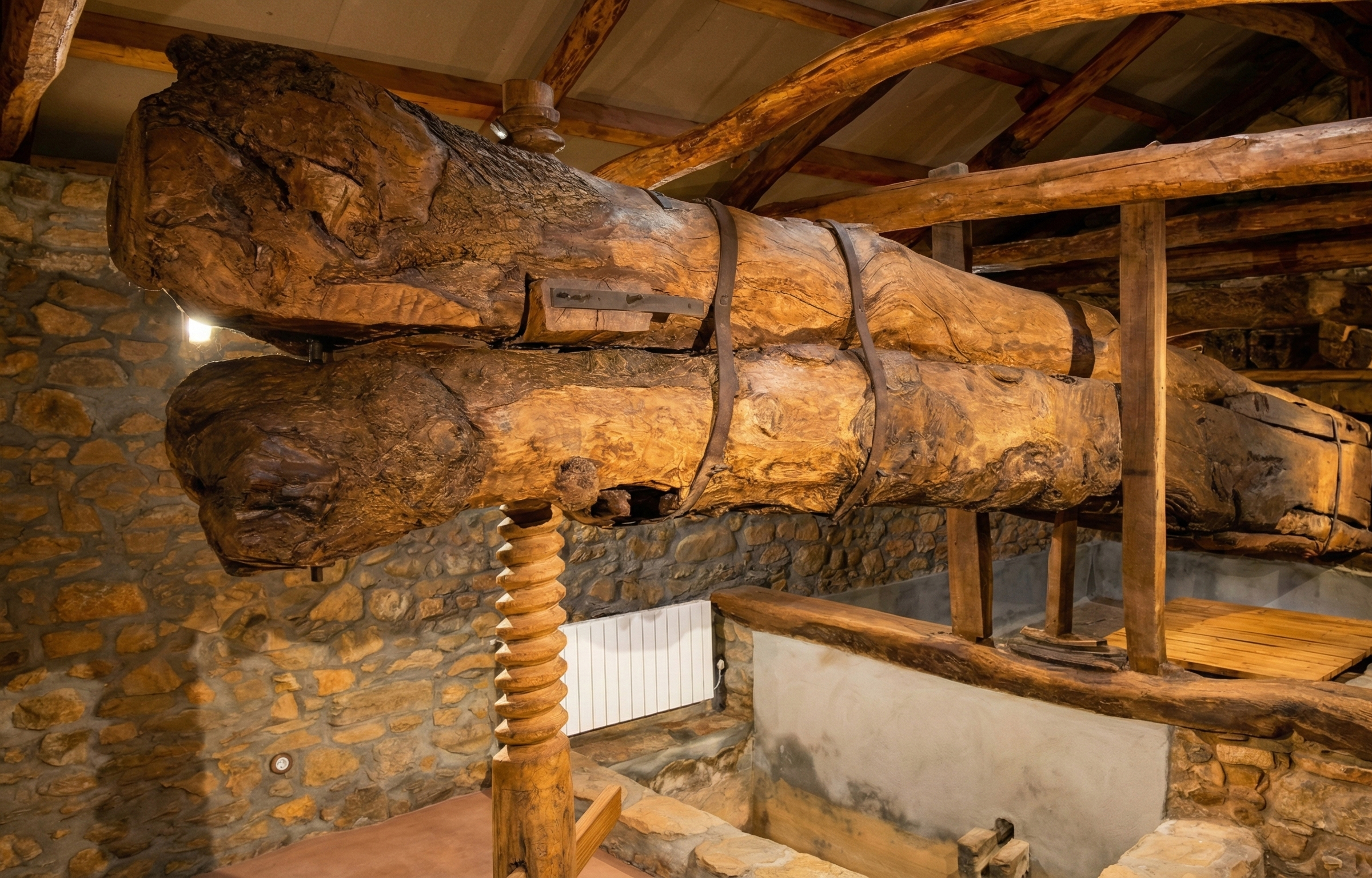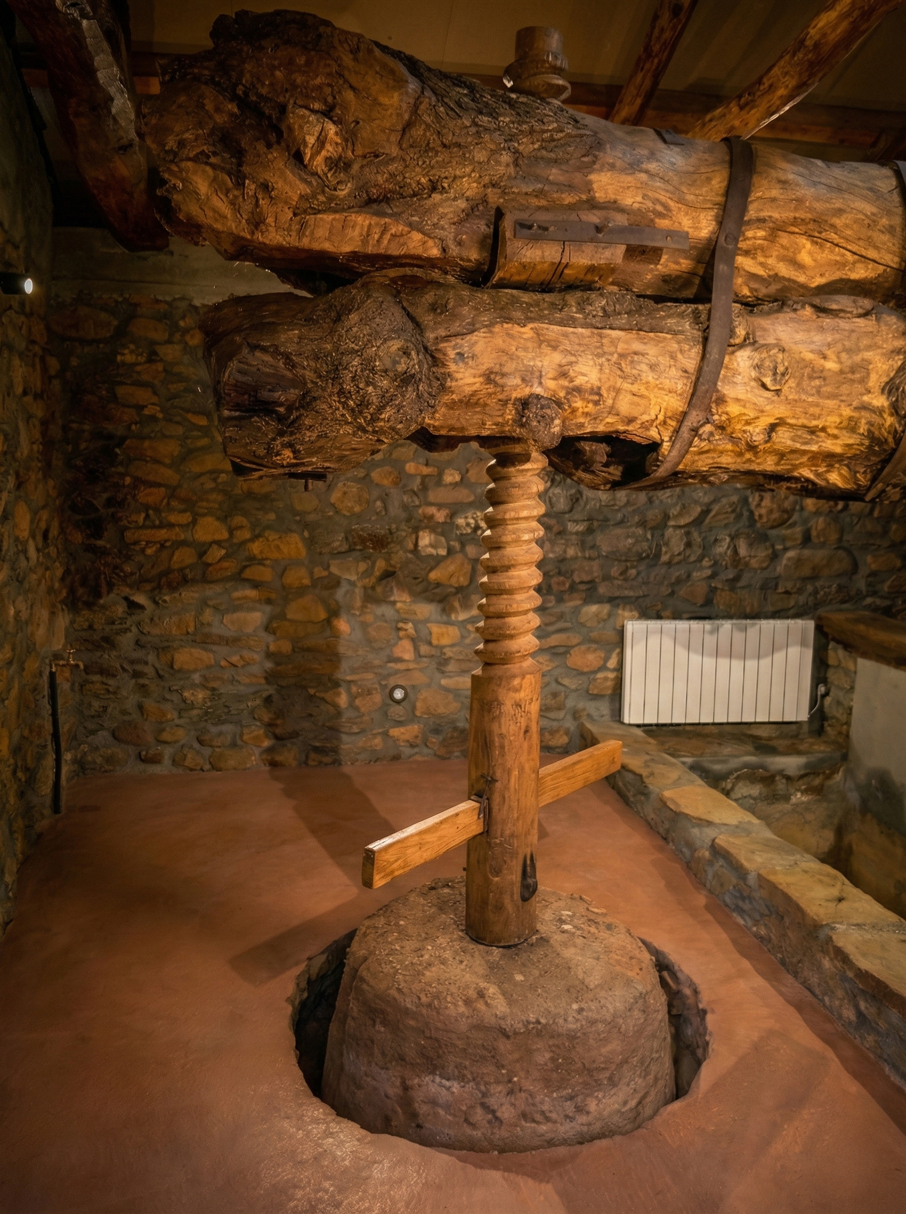 La obra maestra de la ingeniería tradicional del lagar es esta inmensa viga de madera maciza, de entre 15 y 18 metros de longitud. Cuando el pisado inicial no extraía más zumo, los restos de la uva se amontonaban bajo unas tablas. Haciendo girar el huso central que apoya sobre la piedra, la pesada viga iba bajando milimétricamente, prensando la uva con una fuerza brutal.