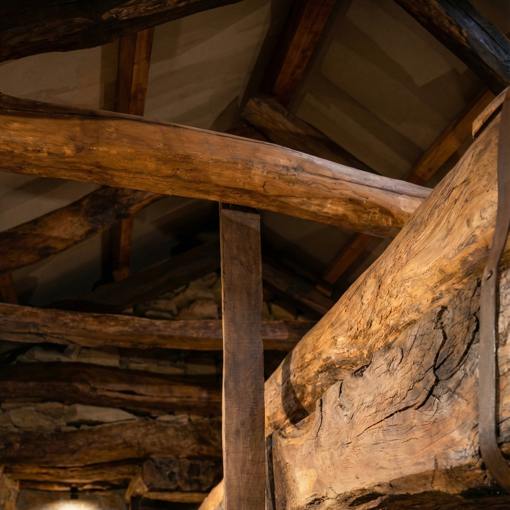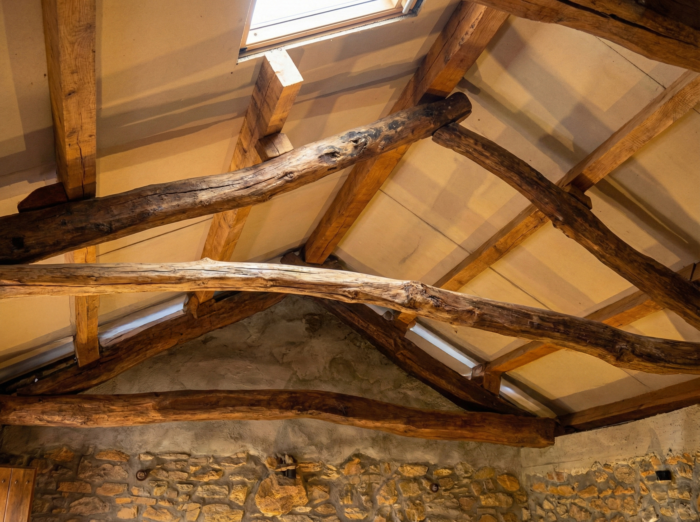 Al levantar la vista, se puede apreciar el cuidadoso trabajo de restauración de la cubierta. Se han reaprovechado y tratado las vigas de madera originales (las cerchas antiguas), que contrastan visualmente con el nuevo entablado hidrófugo y la viguería transversal moderna, dejando a la vista la historia constructiva del edificio.