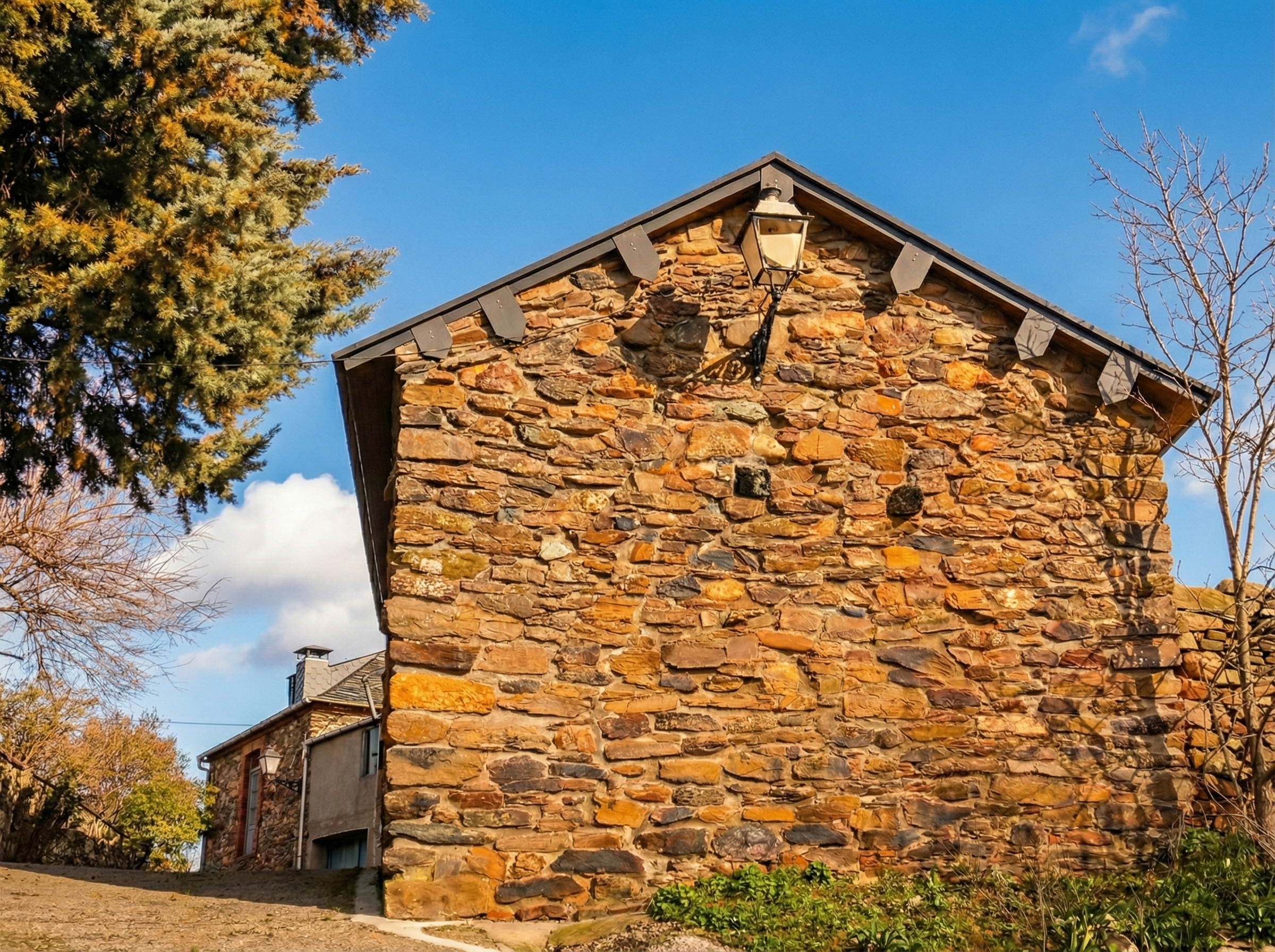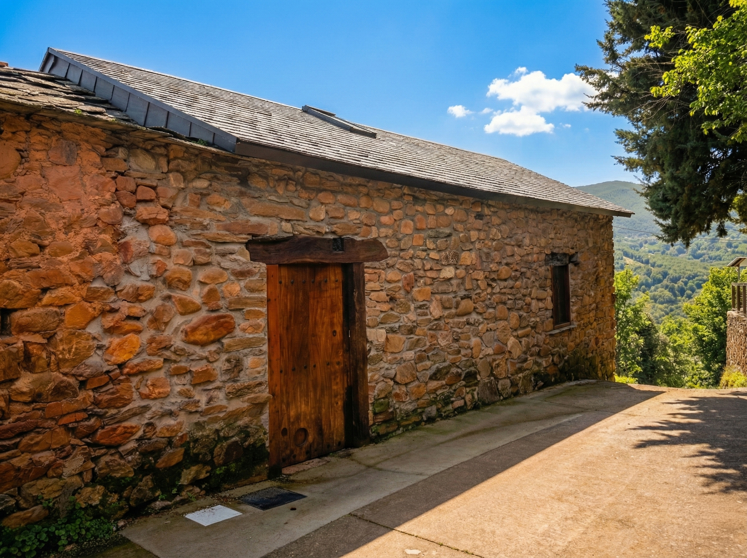 Durante la rehabilitación, se reconstruyó por completo el muro principal, que se encontraba abombado por el paso del tiempo. La cubierta de pizarra fue restaurada respetando la arquitectura original: no cuenta con canalones ni bajantes, permitiendo el desagüe natural de la lluvia.